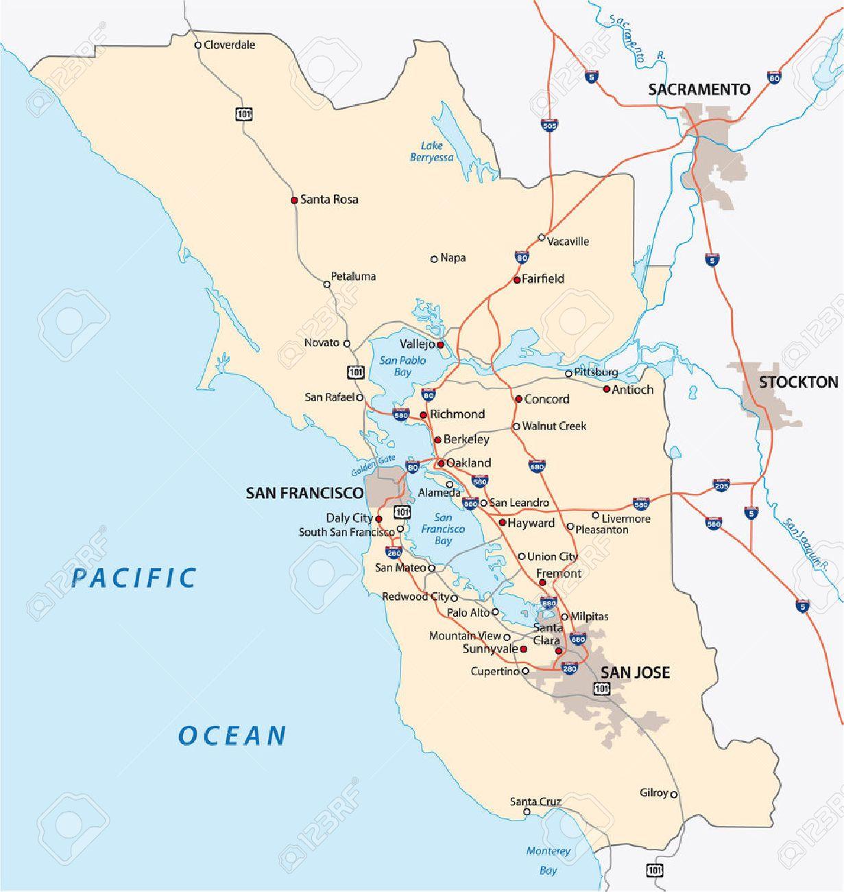 Kaart van die bay area vektor. Bay area vektor kaart (Kalifornië - VSA) te druk. Bay area vektor kaart (Kalifornië - VSA) af te laai.